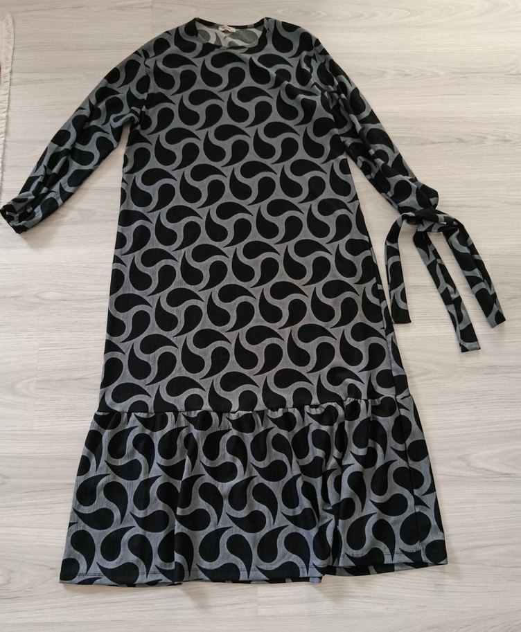 Uzun, gri renkte, bol kesim ve baskılı desene sahip elbise. Etek ucu fırfırlı, uzun kollu, kuşaklı, yuvarlak yakalı, bohem tarzda.(Bedeni olmadığı için hiç kullanılmadı)