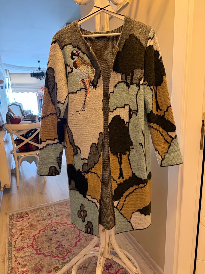 Uzun, örme yün hırka, bol kesim ve yaka detaylıdır. Çok renkli, desenli bohem tarzı ve uzun kolludur, günlük kullanıma uygundur.
