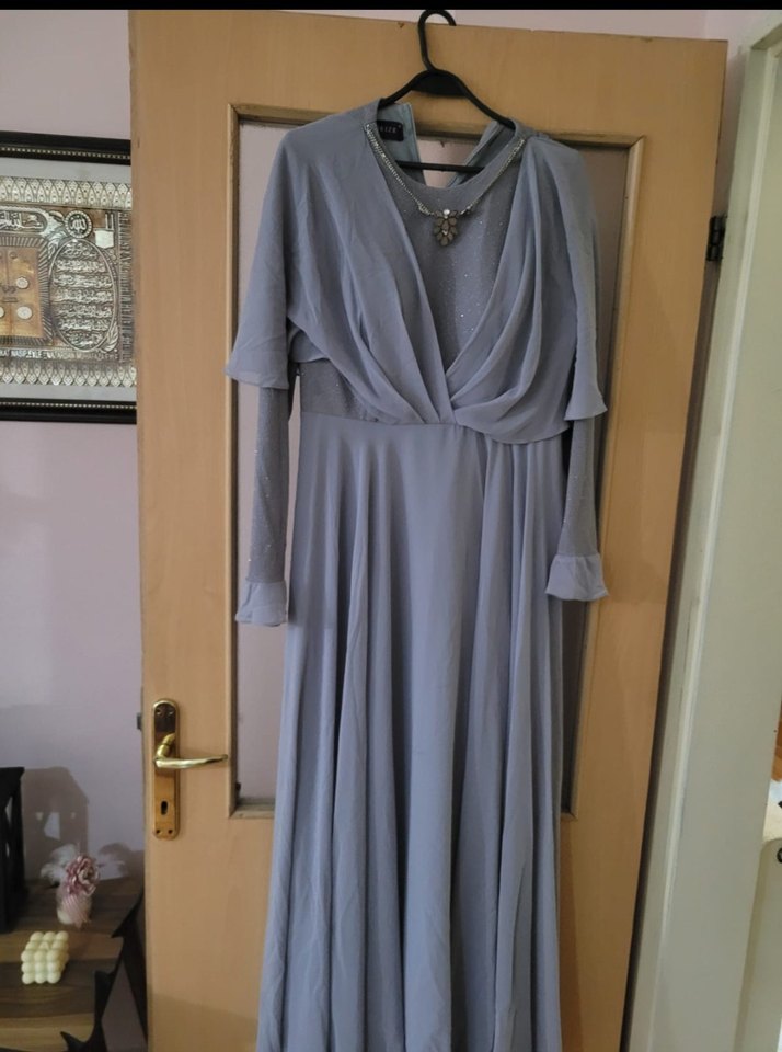 Bu uzun gri elbise, drape detaylı ve bol kesimdir. Uzun kollu, V yakalı ve modern klasik tarzı ile düğünler için uygundur. Desensiz ve vintage şıklık sunar.