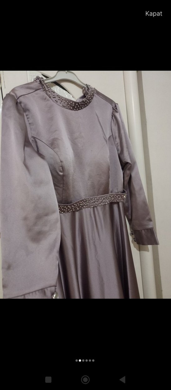 Yüksek yakalı, uzun kollu gri abiye elbise. Drapeli tasarım ve boncuk işlemeli bel detayıyla klasik ve şık bir görünüm sunar.