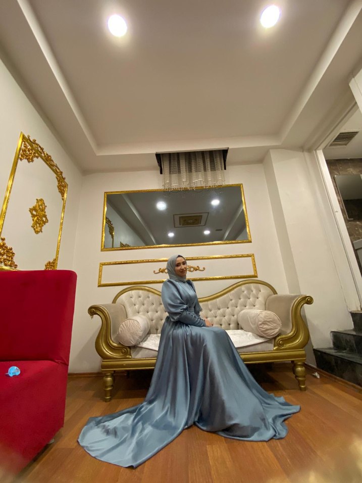 Uzun Gri Drapeli Kadın Abiye Elbise