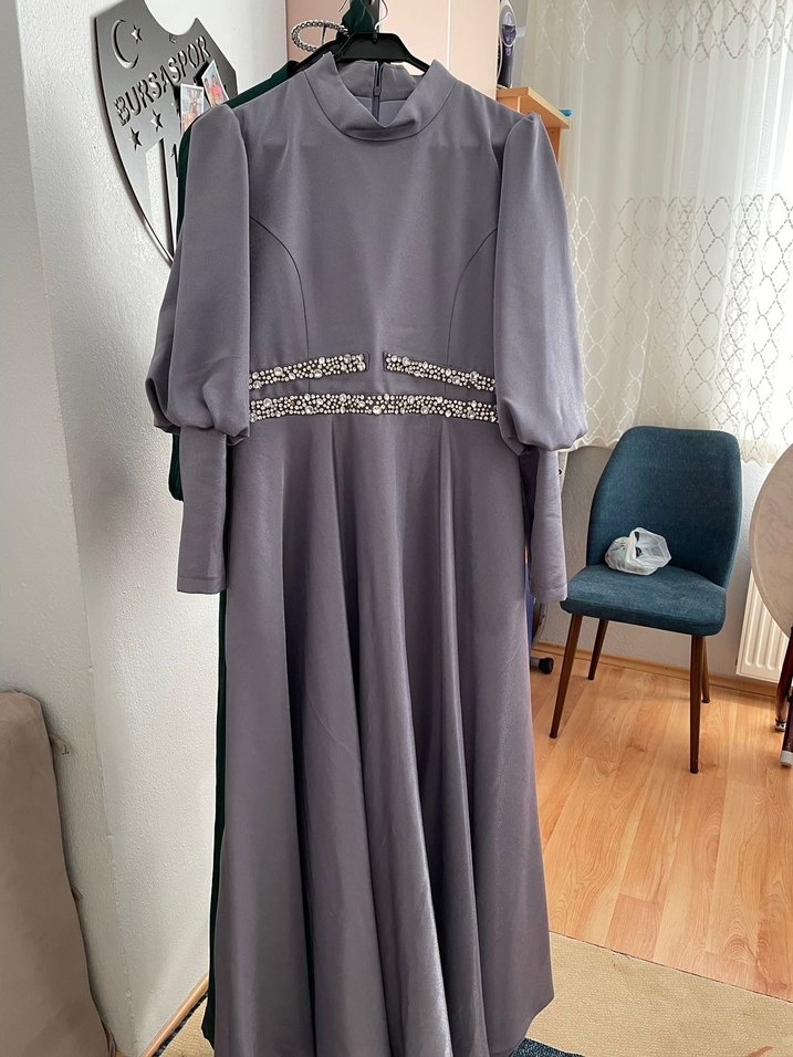 Yüksek yakalı ve uzun kollu, bol kesim uzun gri abiye elbise. Drapeli detayları ve modern klasik tarzı ile düğünler için uygun. Sadece 1 defa kullanıldı marka temsili