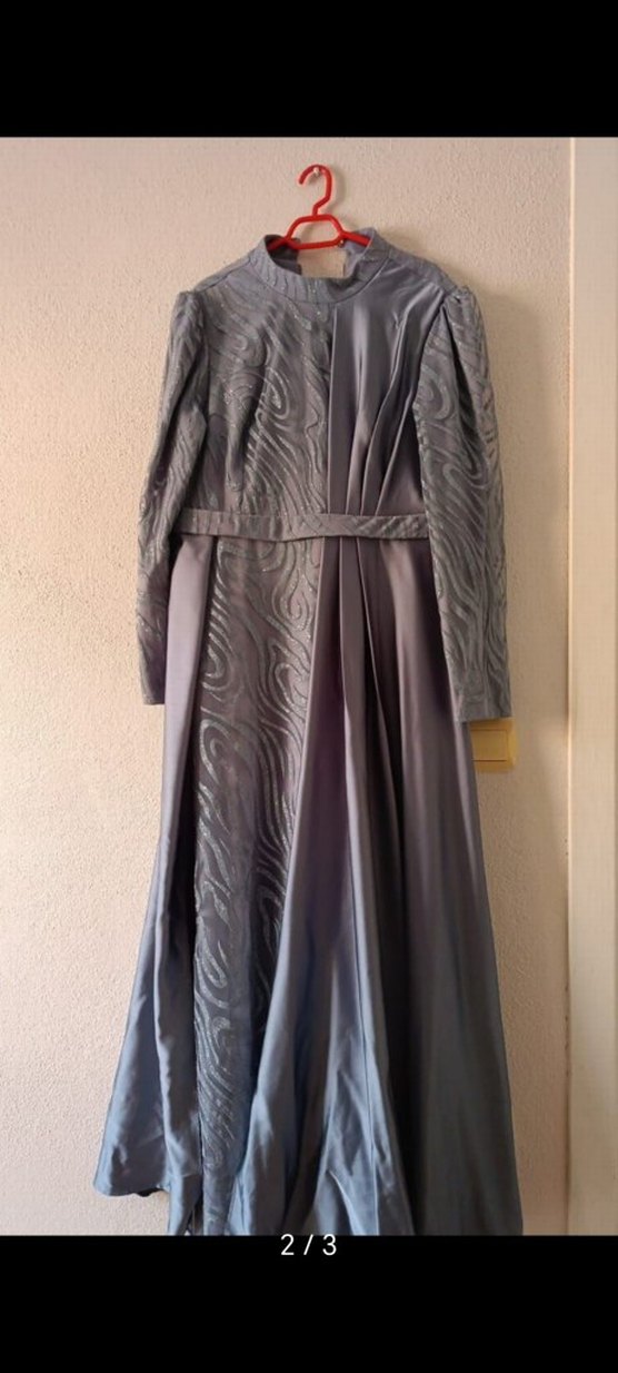 Uzun gri renkte, yüksek yakalı ve uzun kollu drapeli kadın abiye elbise. Vintage ve klasik şıklık sunar, düğünler için uygundur.