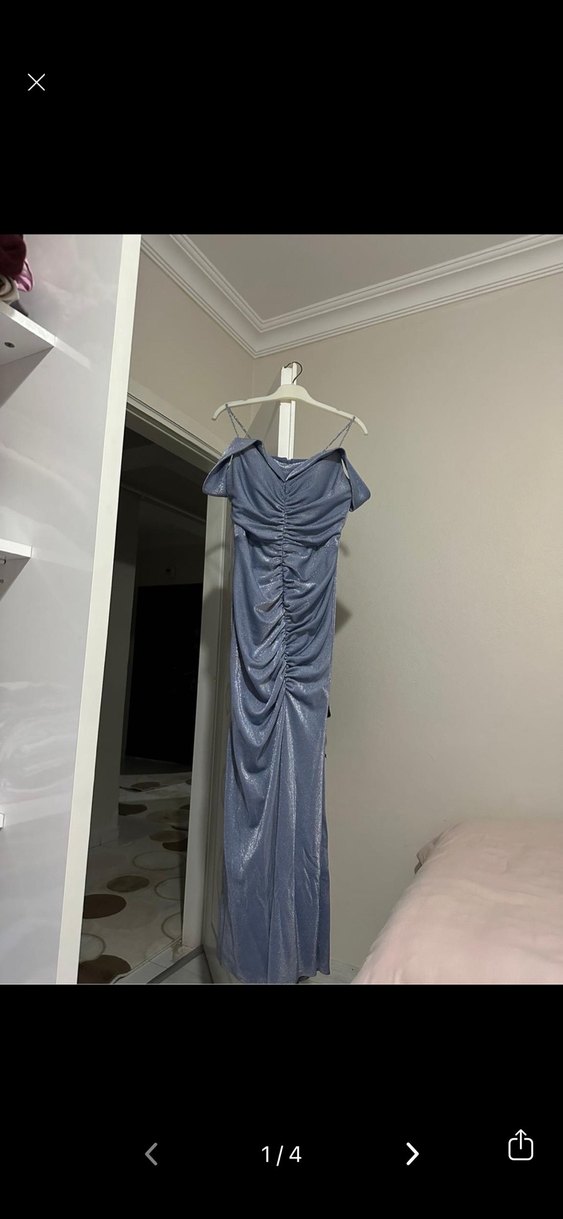 Bu uzun, drapeli ve straplez tasarımlı abiye elbise, modern klasik gri renkte ve şık askılı kollara sahiptir. Düğün gibi özel anlar için uygundur. ✨