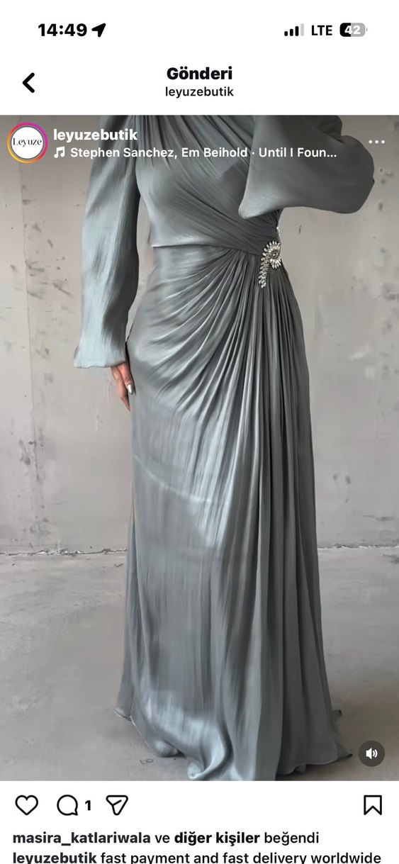 Uzun, gri renkteki bu nişan elbisesi drapeli tasarımı, notched lapel yaka ve uzun kollara sahiptir. Modern klasik ve modest stilde, düğünler için uygundur.