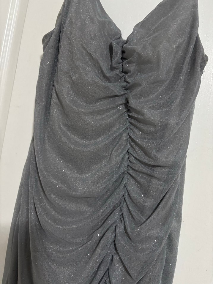 Uzun gri Drapeli V Yaka Kadın Abiye Elbise