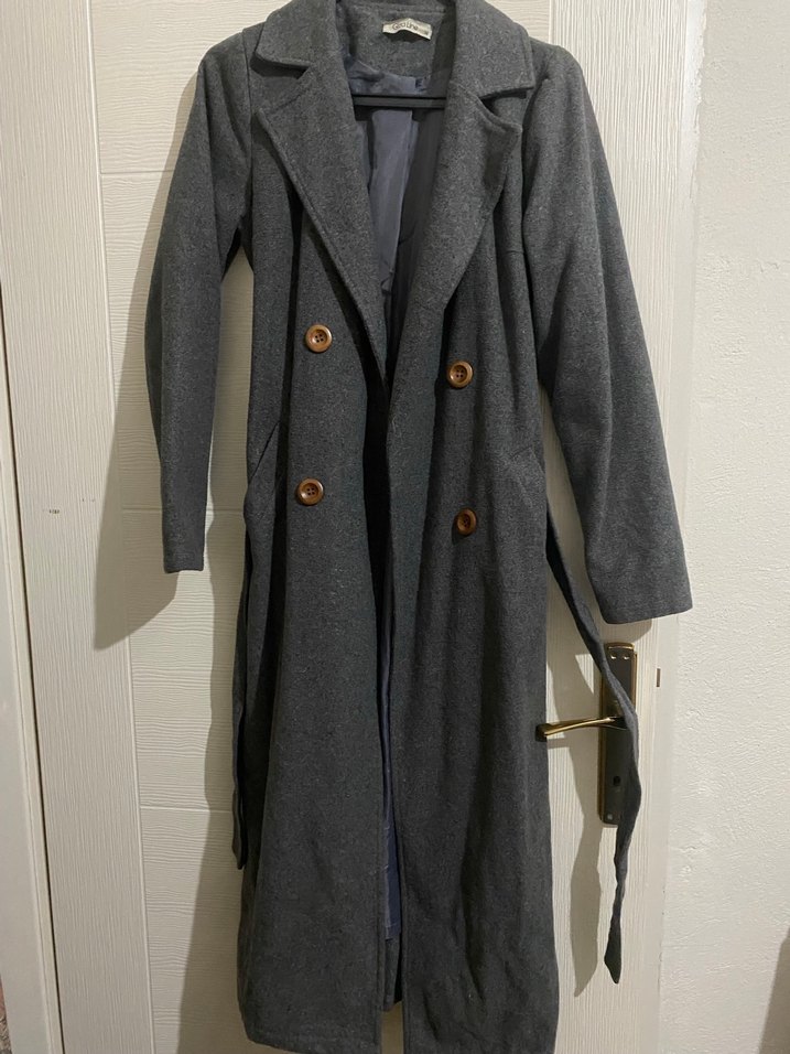 Çift düğmeli, klasik yakalı ve kemerli uzun gri kaban, iç kısmı astarlıdır.