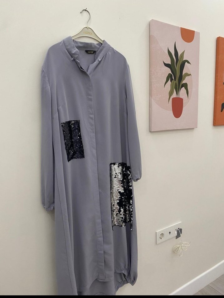 Uzun, bol kesim gri tunik, düğmeli ve yakası kesik detaylıdır. Nakışlı payetli parçalarla süslenmiş, rahat sokak stili için uygundur. Yumuşak sentetik kumaştan yapılmıştır.