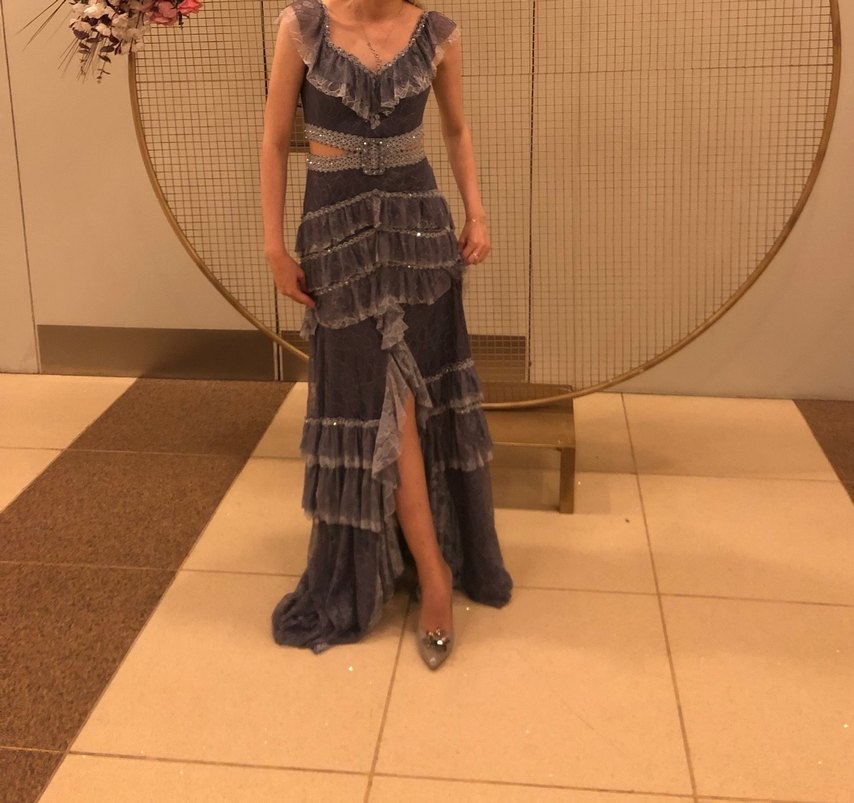 Uzun Gri Fırfırlı Bohem Kadın Abiye Elbise
