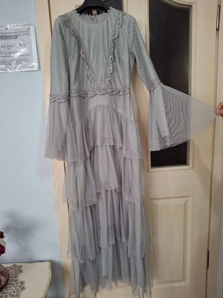 Uzun Gri Fırfırlı İşlemeli Kadın Elbise