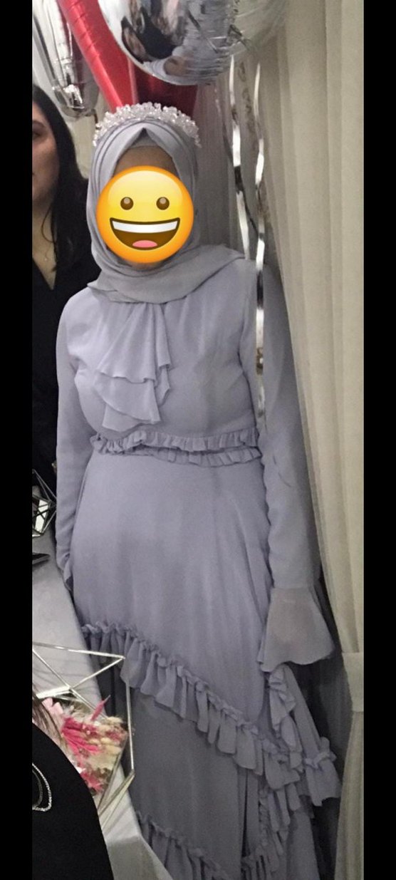 Bu uzun gri elbise, göğüs, bel ve etek kısmında fırfır detaylarına sahip, vücuda oturan kesimdedir. Yüksek yakalı ve uzun kolludur, yumuşak sentetik kumaştan yapılmıştır.