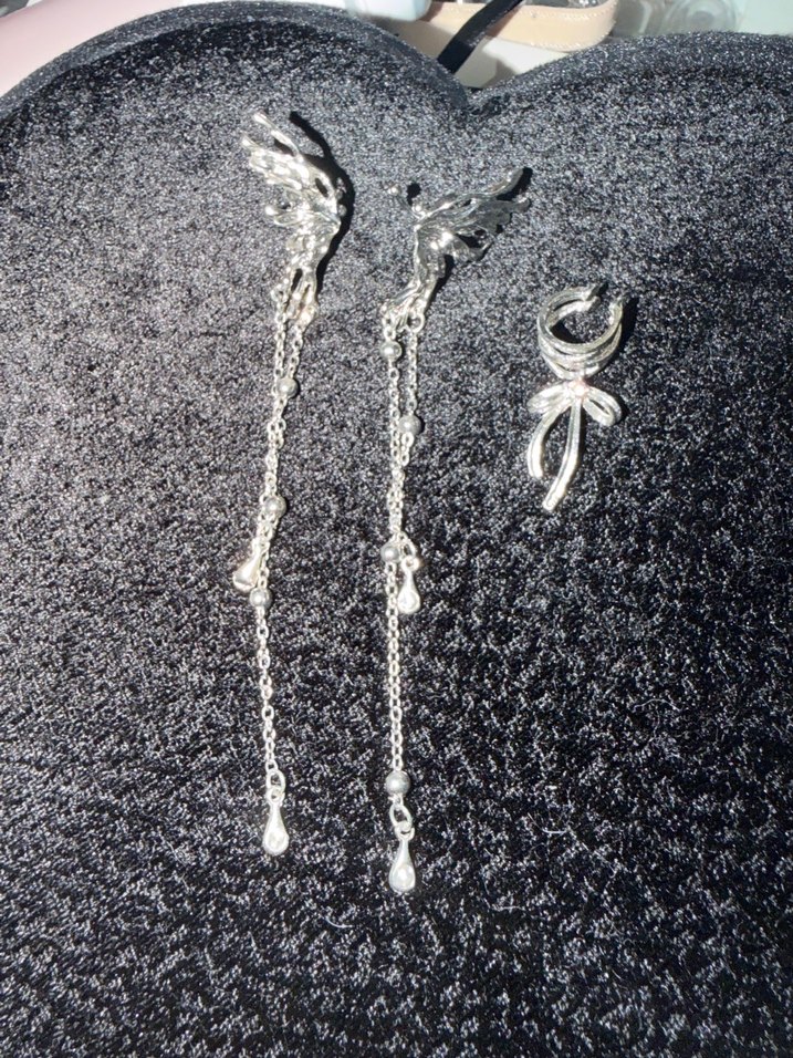 Uzun gri gotik tarzda, boncuklu ve işlemeli detaylara sahip küpeler. Düğün için uygun, trend ve avangart tasarım.