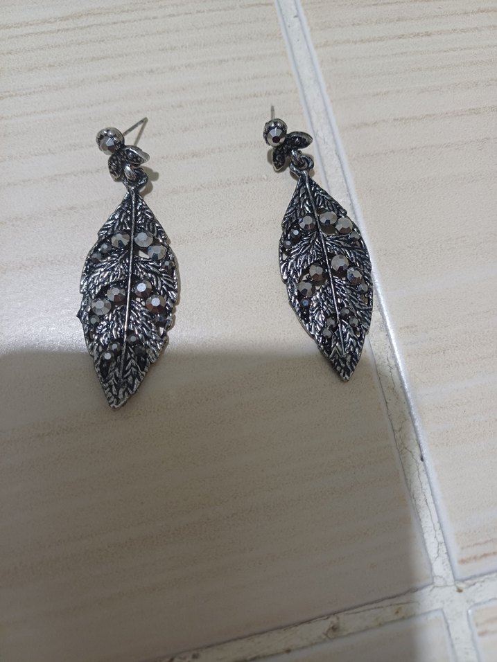 Uzun, gri işlemeli ve boncuk detaylı bohem vintage tarzda günlük kullanıma uygun kadın küpeler.