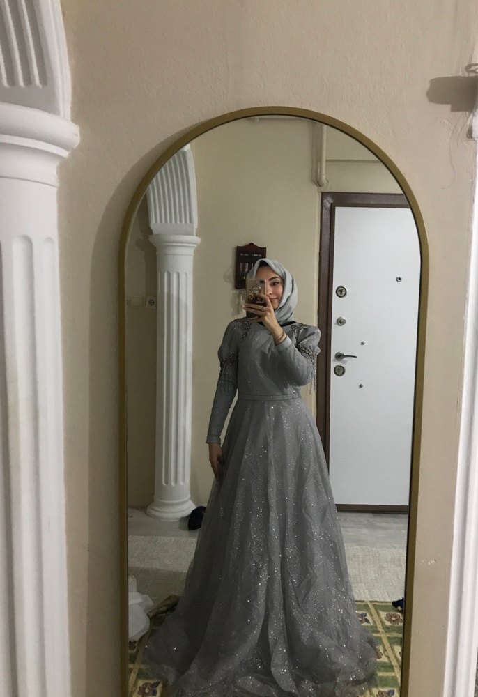 Yüksek yakalı, uzun kollu, işlemeli desenlere ve transparan kumaşa sahip uzun, bol kesim gri abiye, tesettür ve düğünler için uygun.