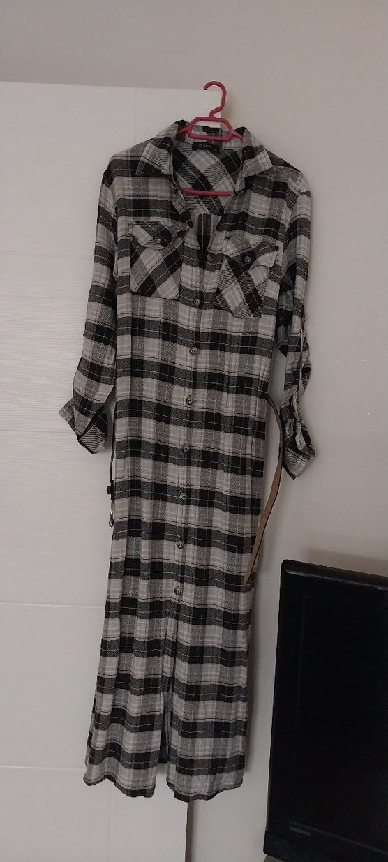 Uzun, bol kesim kadın elbisesi, kesik yaka ve uzun kolludur. Belden kemerli, gri kareli desene sahip, sentetik kumaştan günlük rahat kullanım için uygundur.ici astarlidir