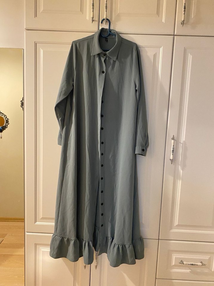 Uzun gri keten elbise, düğmeli ön ve uzun kollu tasarıma sahiptir. Bol kesimi ve yakası notalıdır. Günlük kullanıma uygun sade ve mütevazı stil sunar. 2 kere giyildi pamuklu iç göstermeyen terletmeyen kumaş hiçbir hasarı yok