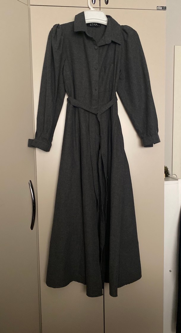 Uzun gri keten elbise, kesik yaka ve uzun kollu. Bol kesim, kemerli ve vintage gotik tarzda, ofis için uygun süeter dışında elbise satılıktır .