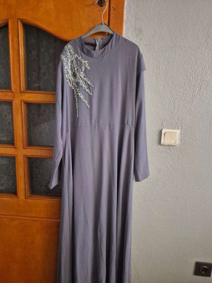 Yüksek yakalı, uzun kollu ve omuzda nakış detaylı gri uzun elbise. Bol kesim ve dökümlü, yumuşak sentetik kumaştan, sade günlük kullanım için uygun.