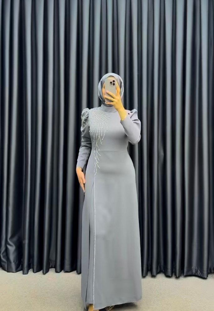 Nakış detaylı, drapeli uzun gri abiye elbise, yüksek yakalı ve uzun kollu, sade ve modern bir tasarıma sahiptir.