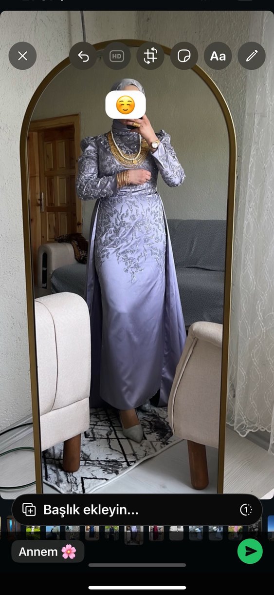 Yüksek yakalı, uzun kollu ve nakışlı detaylara sahip uzun gri abiye elbise. Drape detaylı, klasik ve rahat kesim, düğünler için uygun.