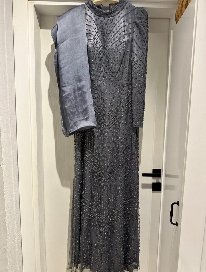 Yüksek yakalı, uzun kollu ve nakışlı detaylara sahip uzun gri abiye elbise. Dökümlü tasarımıyla düzenli kesim ve avangart tarzı için uygundur.