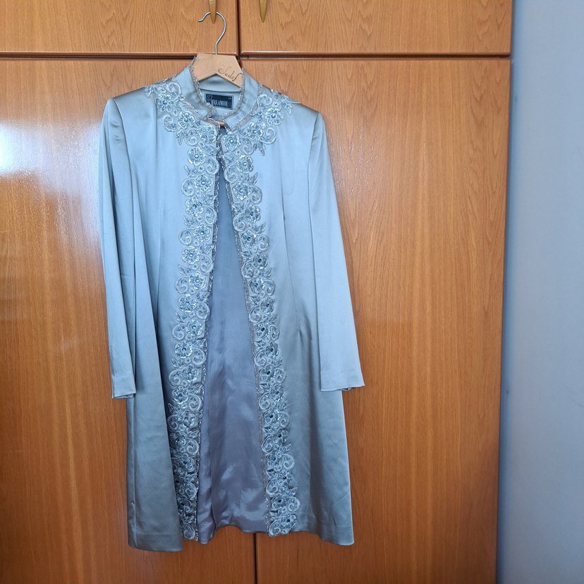Uzun, gri renkte, regular kesim ve uzun kollu kadın elbisesi. Ön ve yaka kısmında vintage tarzı nakış detayları bulunur. Pürüzsüz kumaştan.