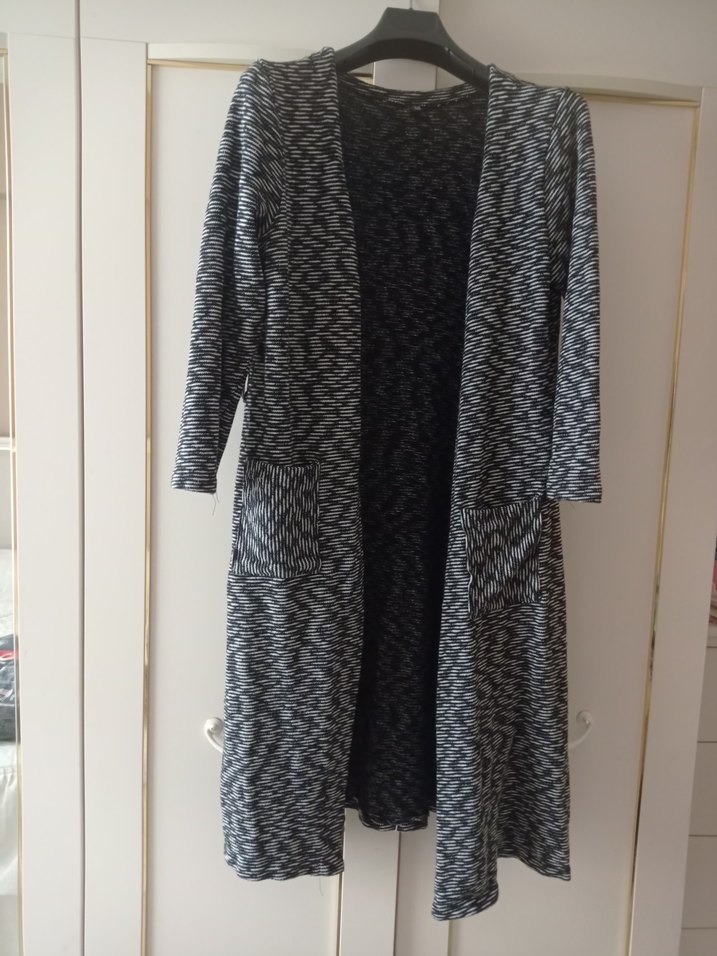 Uzun, gri renkli kadın hırka, örgü dokulu, bol kesim ve uzun kolludur. Notlu yakası ve iki ön cebine sahiptir, günlük kullanım için uygundur.
