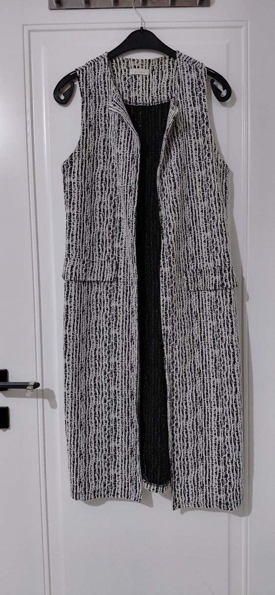 Gri renkte, uzun boy, örgü dokulu, yakası kesik ve kolsuz kadın yeleği, rahat kesimiyle günlük kullanım için uygundur.