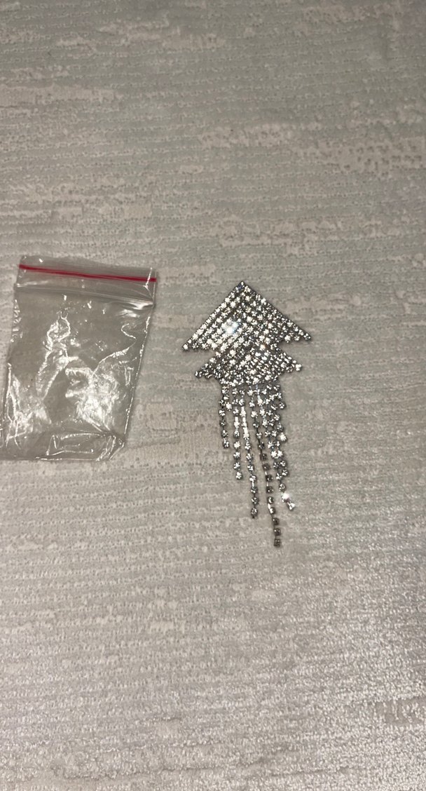 Uzun gri küpe, payetli ve nakışlı detaylara sahip, rock punk tarzında, avant-garde parti görünümleri için uygun. ✨