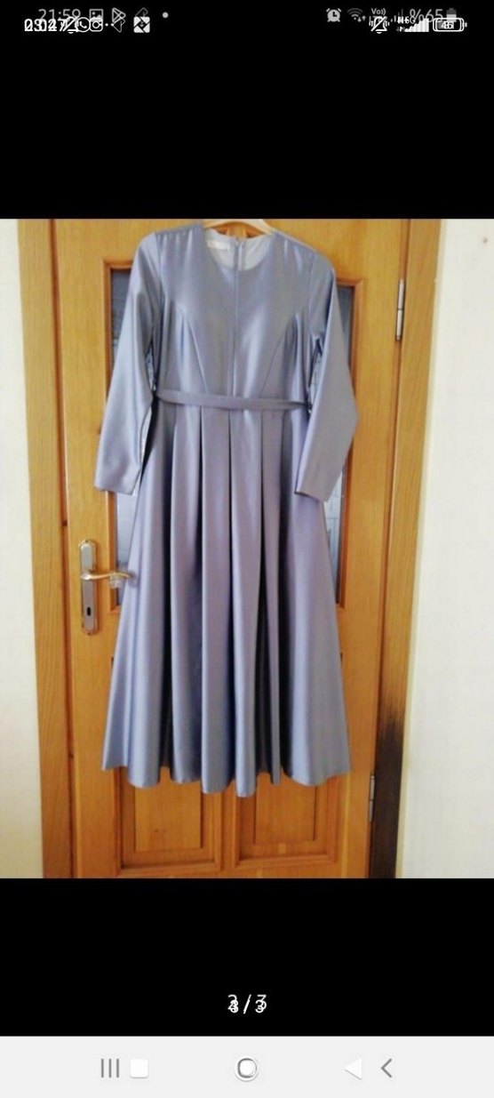 Uzun, gri renkli pilili abiye elbise, yüksek yakalı ve uzun kolludur. Klasik vintage tarzında, düzenli kesimlidir. Düğünler için uygundur.