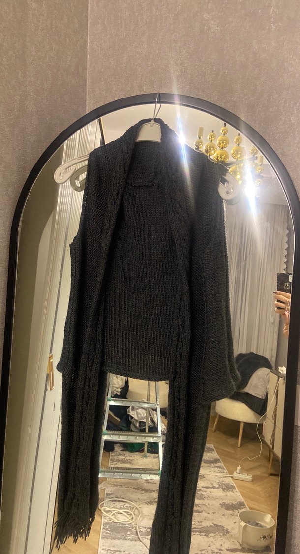 Uzun Gri Triko Boğazlı Kolsuz Hırka