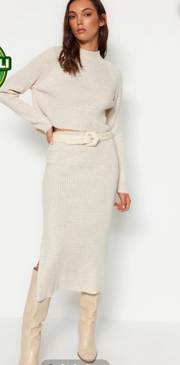 Yumuşak sentetik kumaştan, yüksek yakalı ve uzun kollu, uzun ve vücuda oturan krem rengi triko kadın alt üst takım. Günlük rahat kullanıma uygundur.
