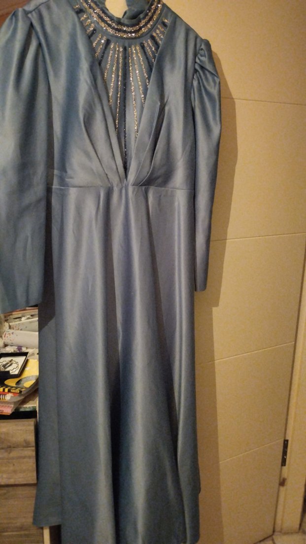 Uzun gri renkte, V yakalı ve drapeli tasarıma sahip kadın elbisesi. Uzun kollu, bol kesim ve bohem tarzda, ofis kullanımı için uygun.