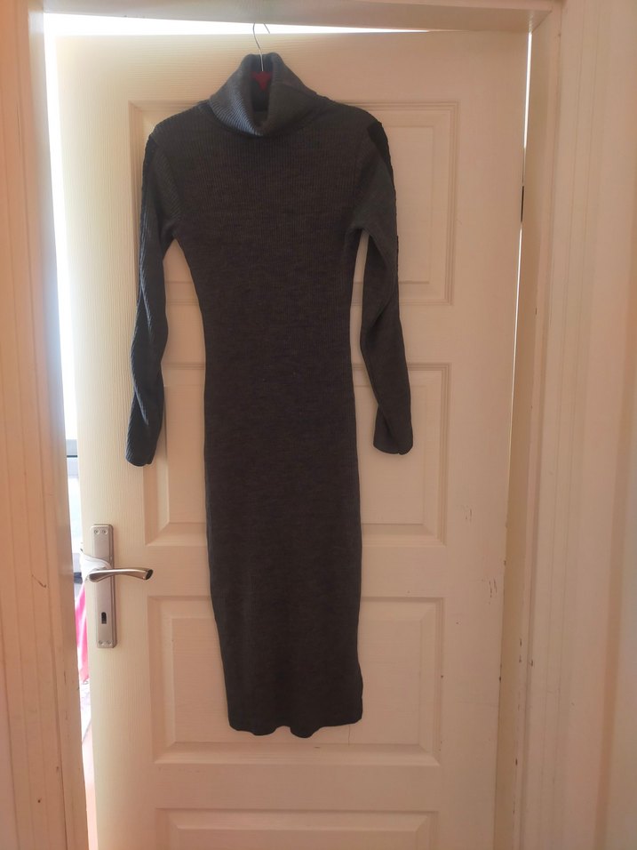 Gri renkte, yünlü örgü kumaştan yapılmış, yüksek yakalı ve uzun kollu, vücuda oturan uzun elbise. Minimalist ve normcore tarzda, günlük kullanım için uygundur.