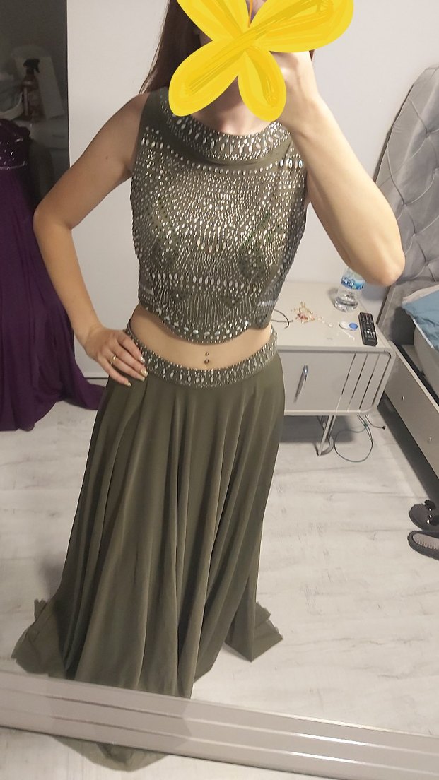 taşları sağlamdır. Uzun, haki, bol kesim ve drapeli gece elbisesidir. bohem tarzıyla romantik buluşmalar için uygundur. Desensiz ve modaya uygun bir tasarımdır.