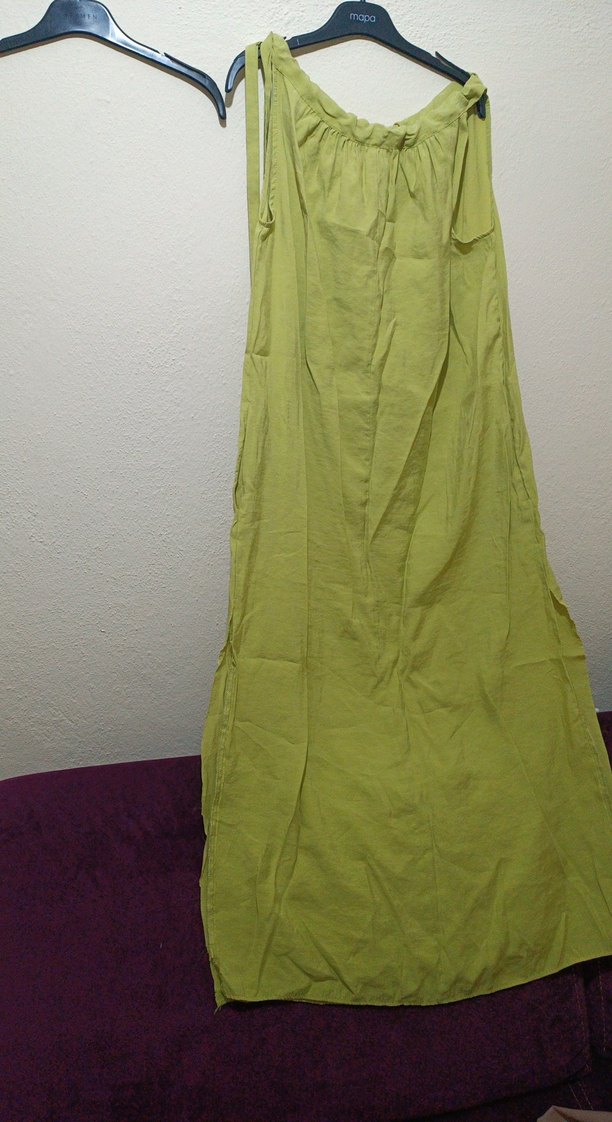 Uzun, haki renkli hamile eteği, bol kesim ve drapeli tasarıma sahiptir. Yumuşak keten kumaştan, parlak görünümlü ve bohem tarzındadır.
