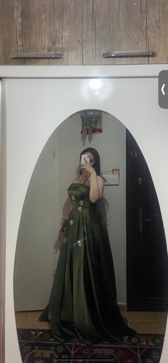 Uzun, fitted haki straplez abiye elbise.ince askılı, şık bir düğün elbisesi.