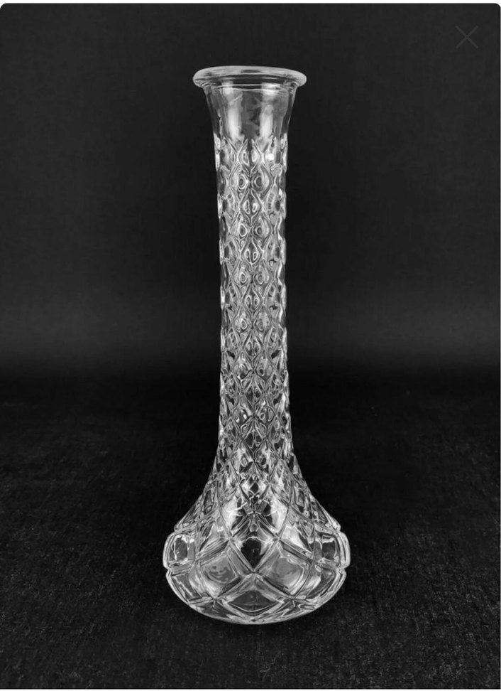 Uzun ve ince beyaz camdan yapılmış, elmas desenli dokulu bir vazo. Dar boyunlu ve geniş tabanlı, tek çiçek için uygun.