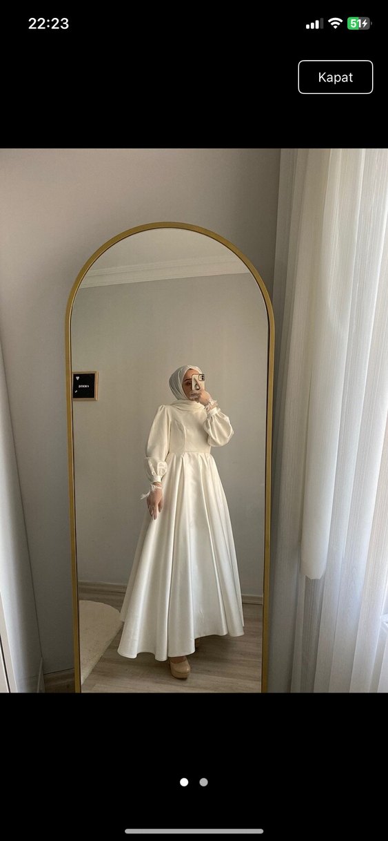 Yüksek yakalı, uzun kollu, ince dökümlü uzun beyaz elbise. İpek gibi kumaştan, salaş kesim ve modern klasik tarzda, düğünler için uygun. Satılıktır