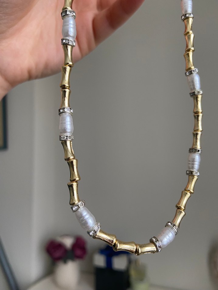 Uzun İnci ve Taş Detaylı Gold Kolye