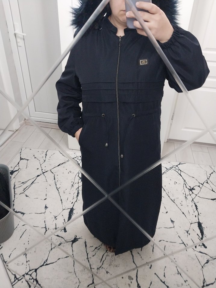 lacivert uzun, fit kaban, uzun kollu ve kesik yaka detaylıdır. Kürk detayları var zümranur marka