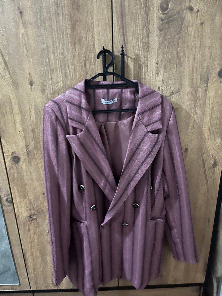 Mor renkli kadın blazer, kesik yaka ve düğmeli kapama özelliğine sahiptir. Parlak sentetik kumaştan üretilmiş, uzun ve regular fit kesimdir. Sokak stili için şık bir tercihtir. 44 bedendir durumu çok iyi hiç kullanılmadı..