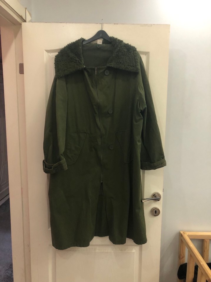 uzun ceket, kürklü yakası ve bol kesimiyle rahat bir sokak stili sunar. Uzun kollu, yumuşak ve sıcak kumaştan, günlük kullanıma uygundur.