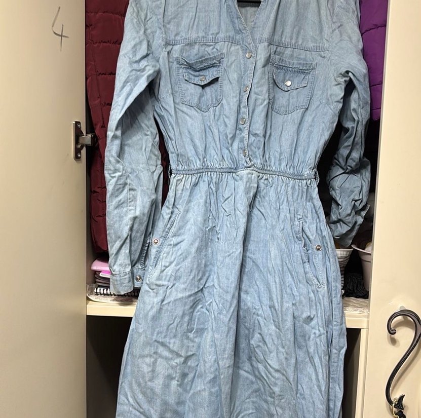 Fitted kesim denim elbise uzun kollu, kesik yakalı ve düğmeli ön kapamalıdır. Göğüs cepleri ve uzun boyu vardır. Günlük sokak stili için uygundur.