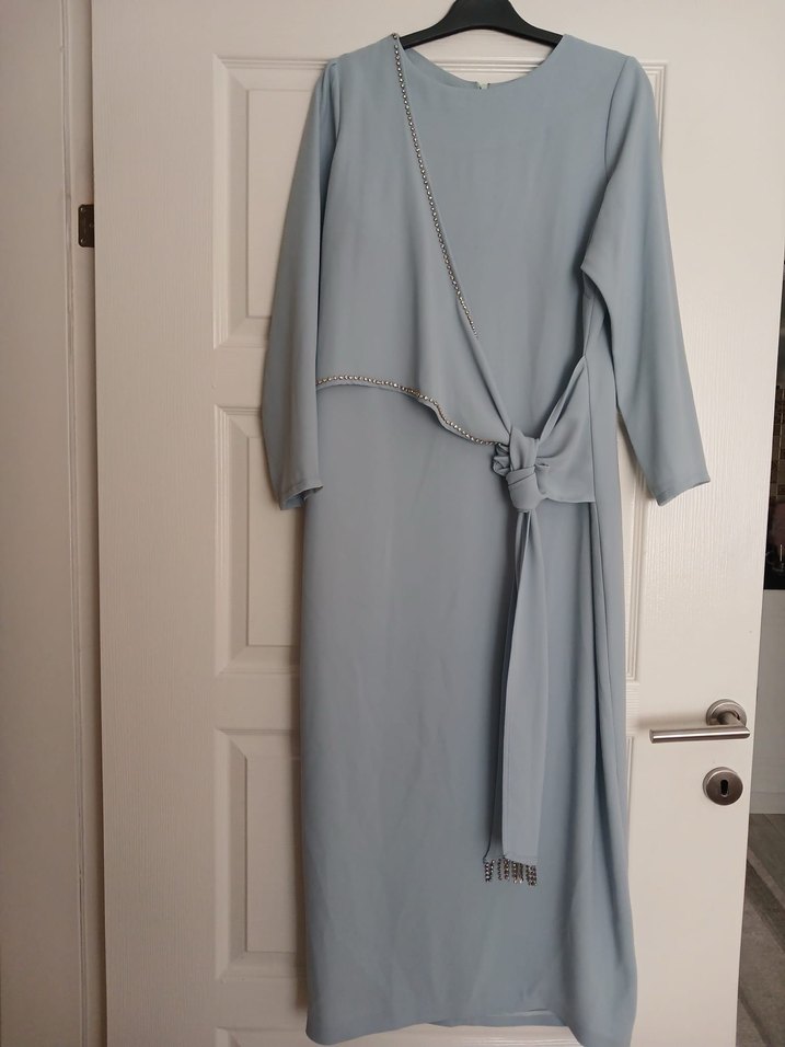 Özel dikimdir. 38/40 bedene uyumludur. Bebe mavisi renktedir Uzun, kadın elbisesi, regular kesim ve uzun kollu. Minimalist ve desensiz tasarıma sahip, belde bağlama detayı bulunur.