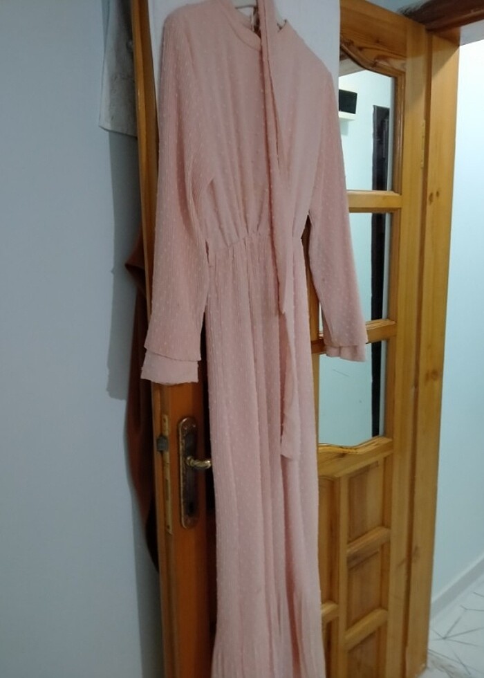 Rengiyle duruşuyla çok hoş bir elbise kalitesi mükemmel piliseli pudra yazı anımsatıyor resmen