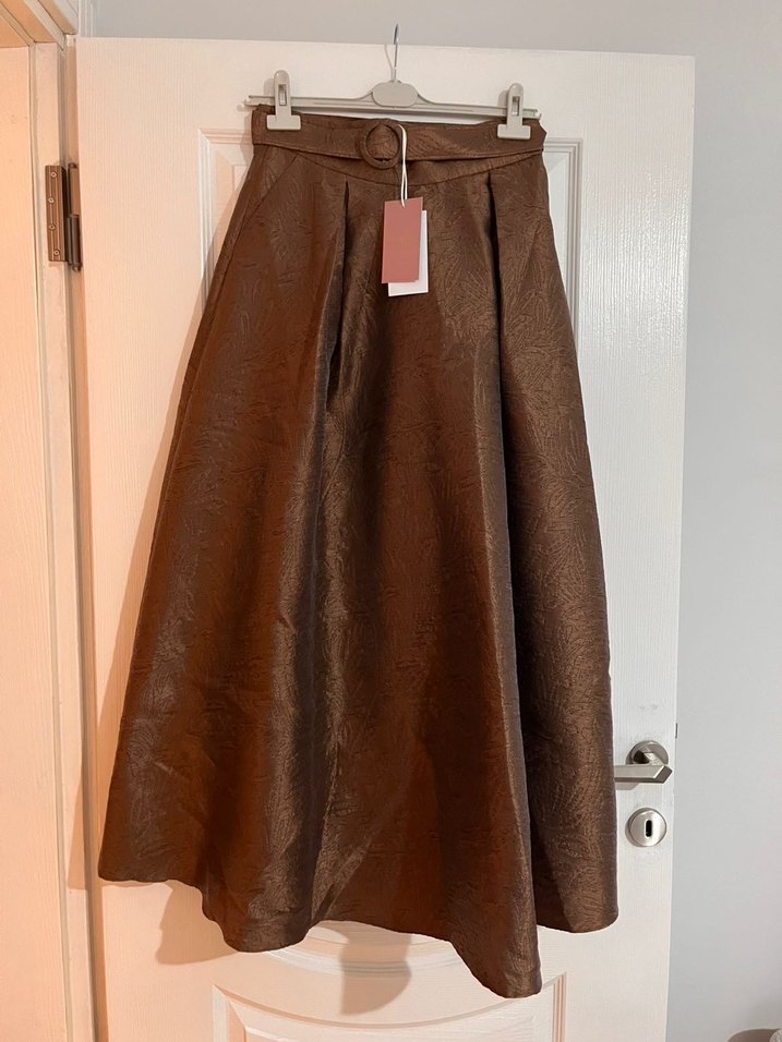 Kahverengi, ipeksi dokulu, pilili ve bol kesim uzun etek, klasik bohem tarzını yansıtır, ofis için uygun.
