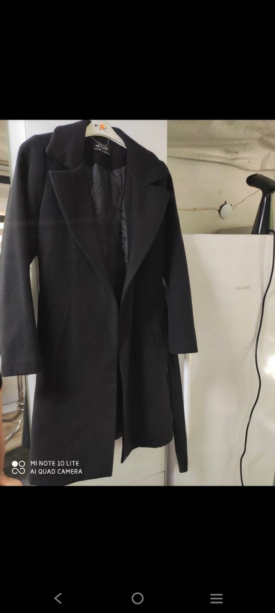 Siyah renk, kemerli ve uzun kesim kadın kaban. Notlu yaka ve uzun kollu, rahat kalıp ile şık ve sıcak bir görünüm sunar.