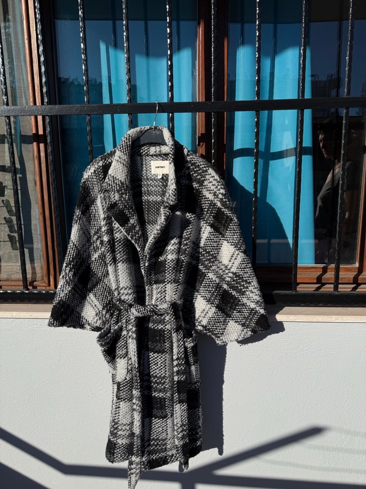 Gri kareli, uzun ve yara kol kesim kadın kaban. Yumuşak yünden, kuşaklı günlük kullanıma uygun rahat ve şık bir modeldir. L beden.