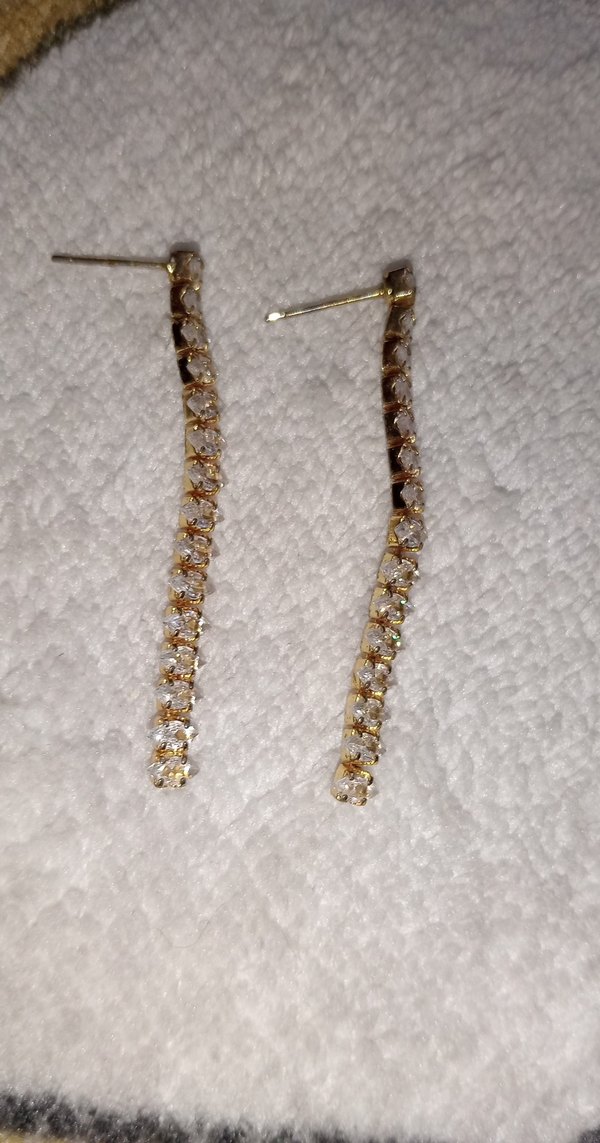Uzun, taşlarla süslenmiş kadın küpeleri, hafif beyaz tonda ve tüylü detaylıdır. Klasik şıklık ve düğünler için uygundur.